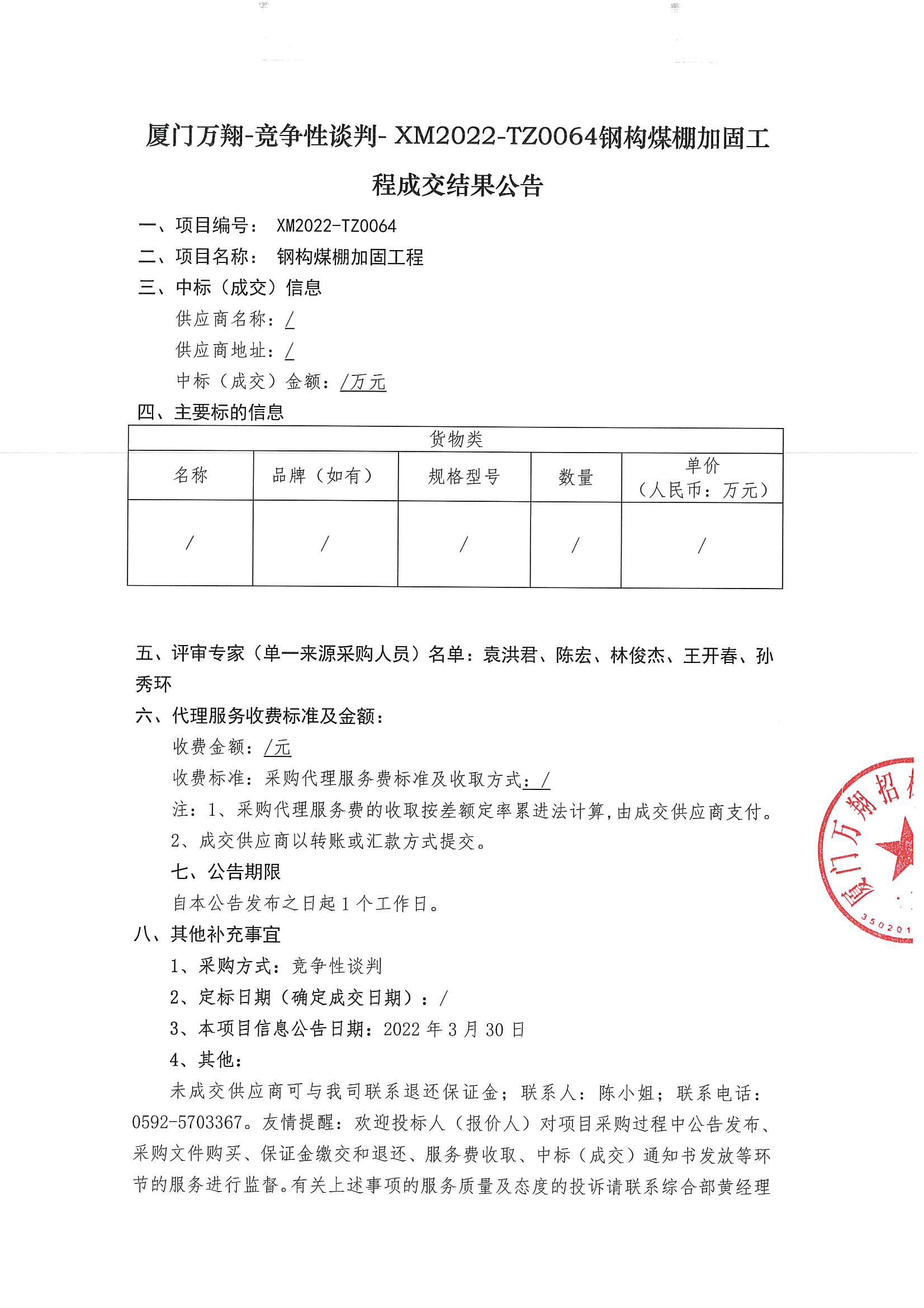 廈門萬翔-競(jìng)爭(zhēng)性談判-XM2022-TZ0064鋼構(gòu)煤棚加固工程成交結(jié)果公告